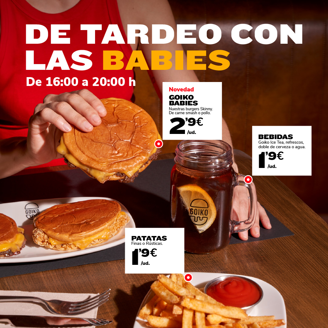 🍻 ¡Tardeo con las Babies! 🍔 Disfruta de 16:00 a 20:00h de nuestras burgers Goiko Babies en versión Skinny de carne smash o pollo por solo 2,90€.